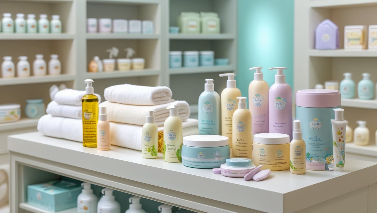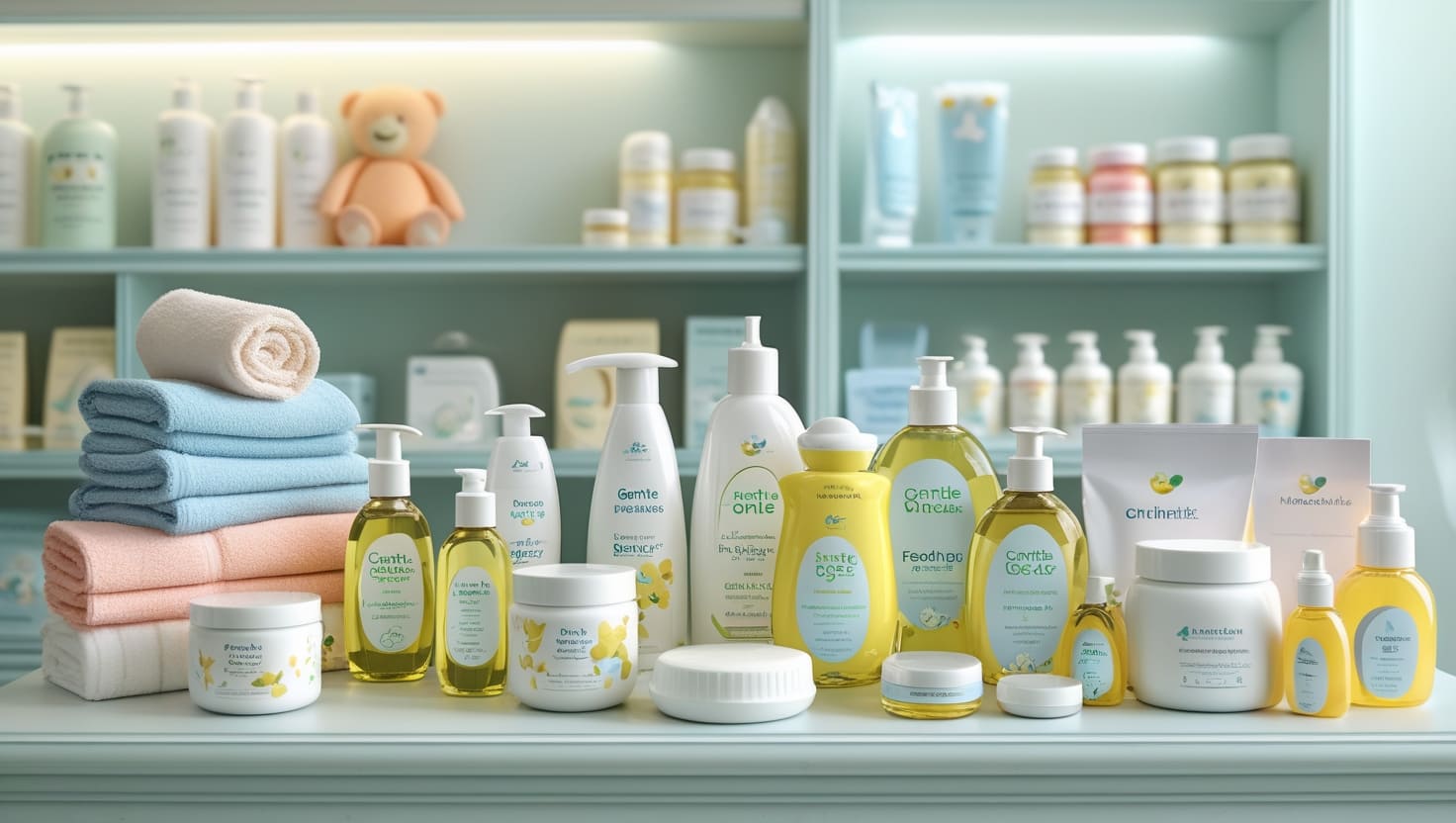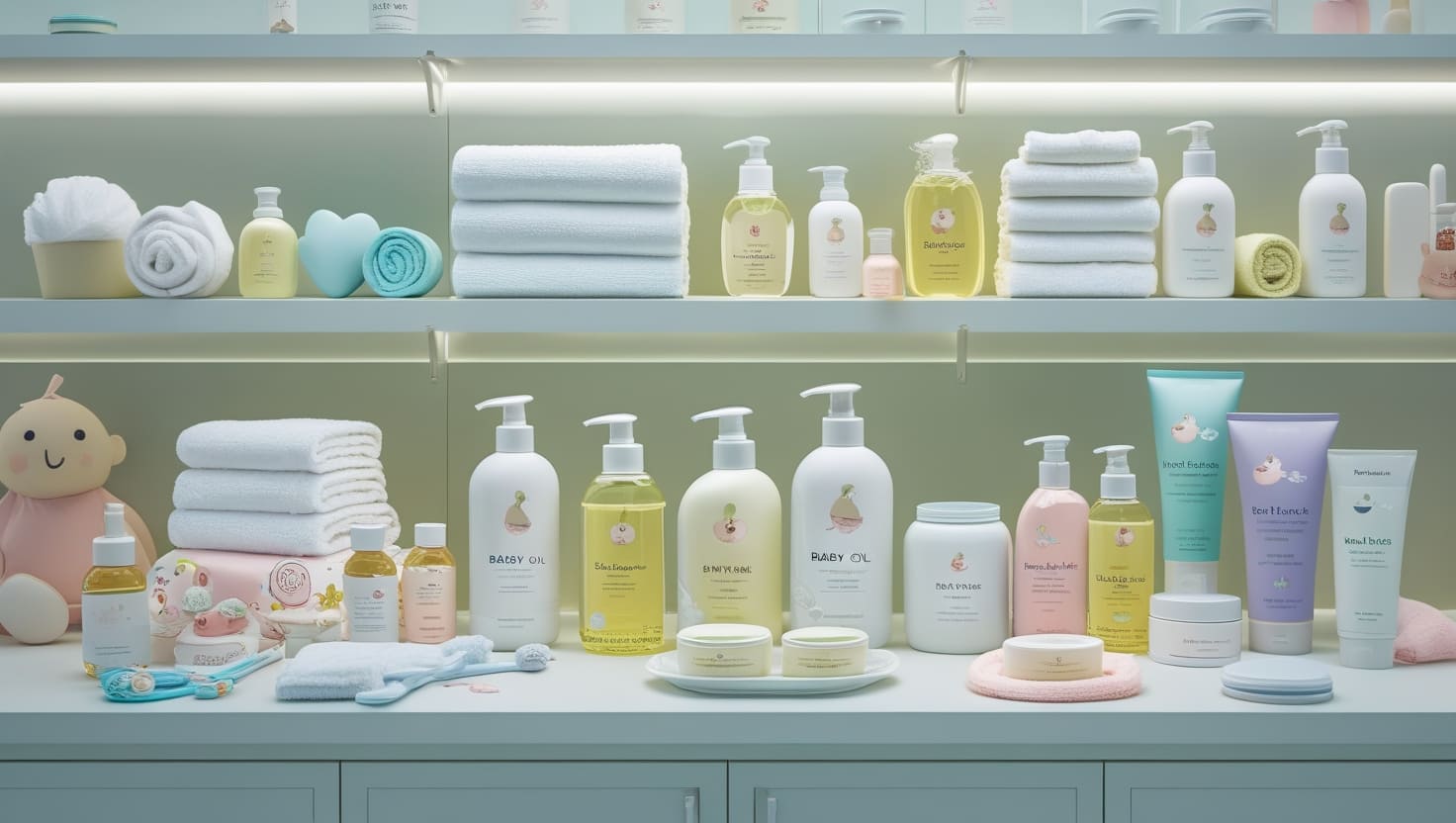 Mild soaps, shampoos, body lotions, massage oils, and powders specially formulated for delicate baby skin.