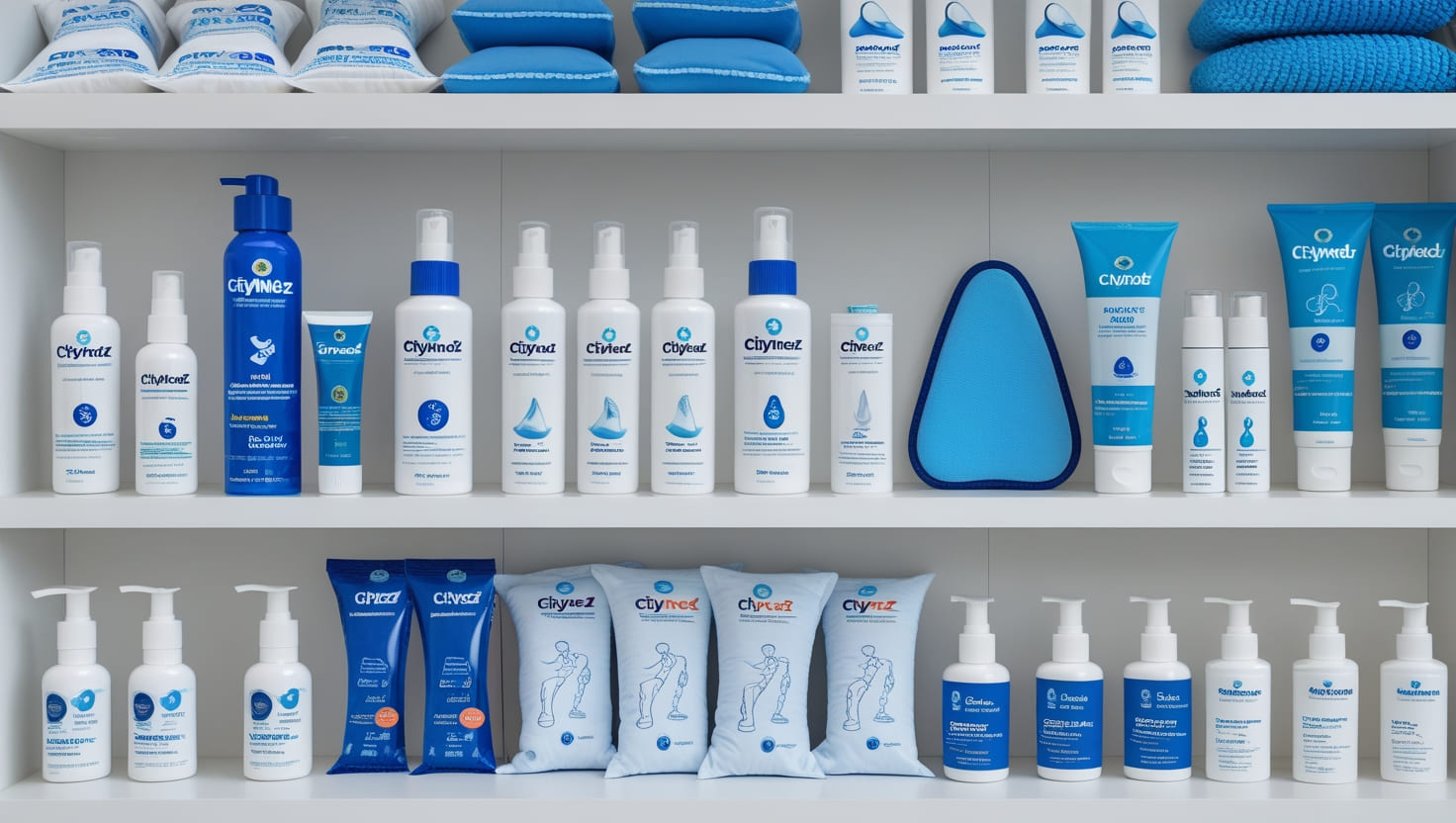 Pain relief sprays, body supports, multivitamins, mobility aids, adult diapers, and monitoring devices for senior wellness.