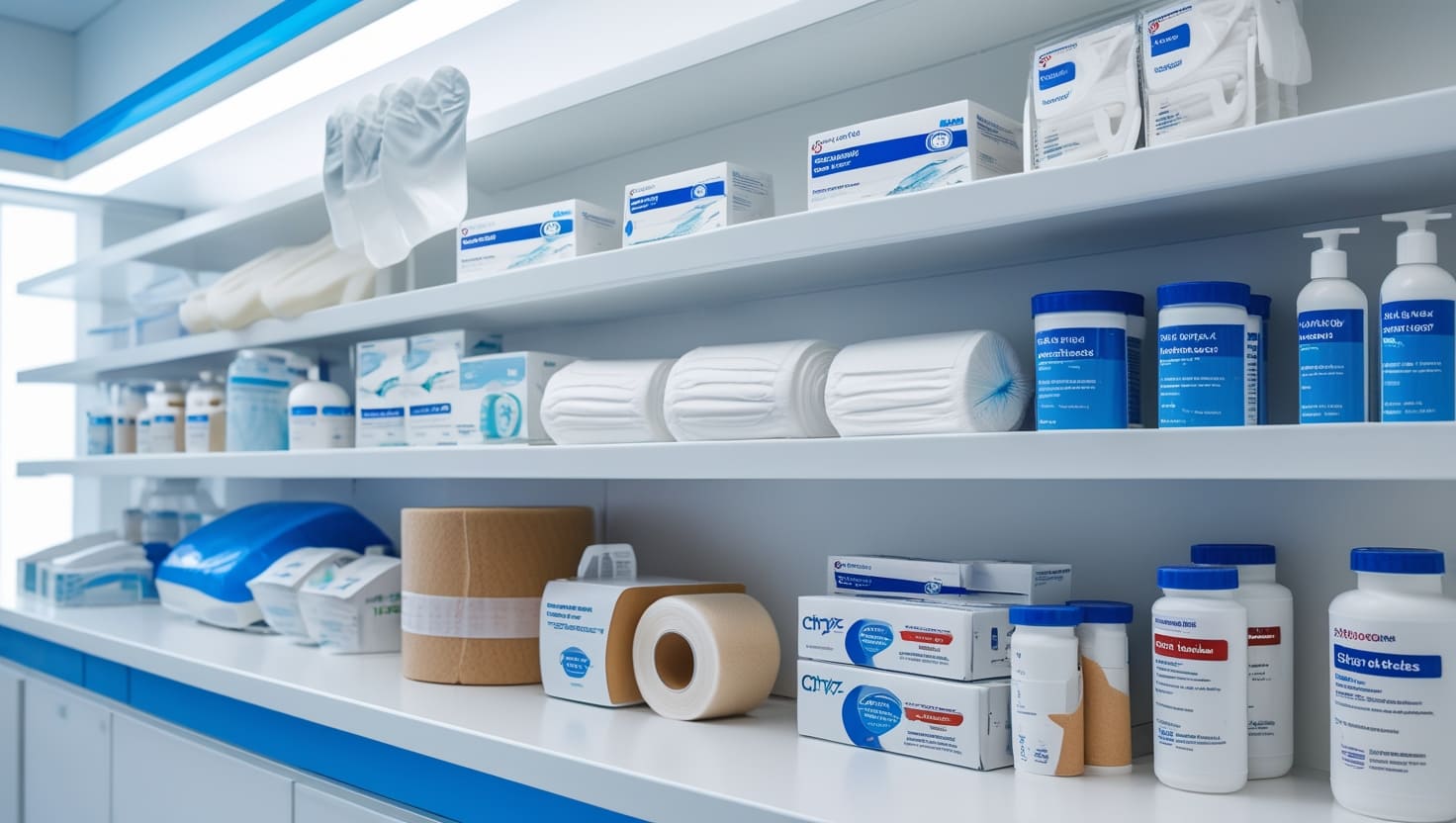 Bandages, gauze, adhesive tapes, antiseptic solutions, burn creams, and advanced wound healing dressings.